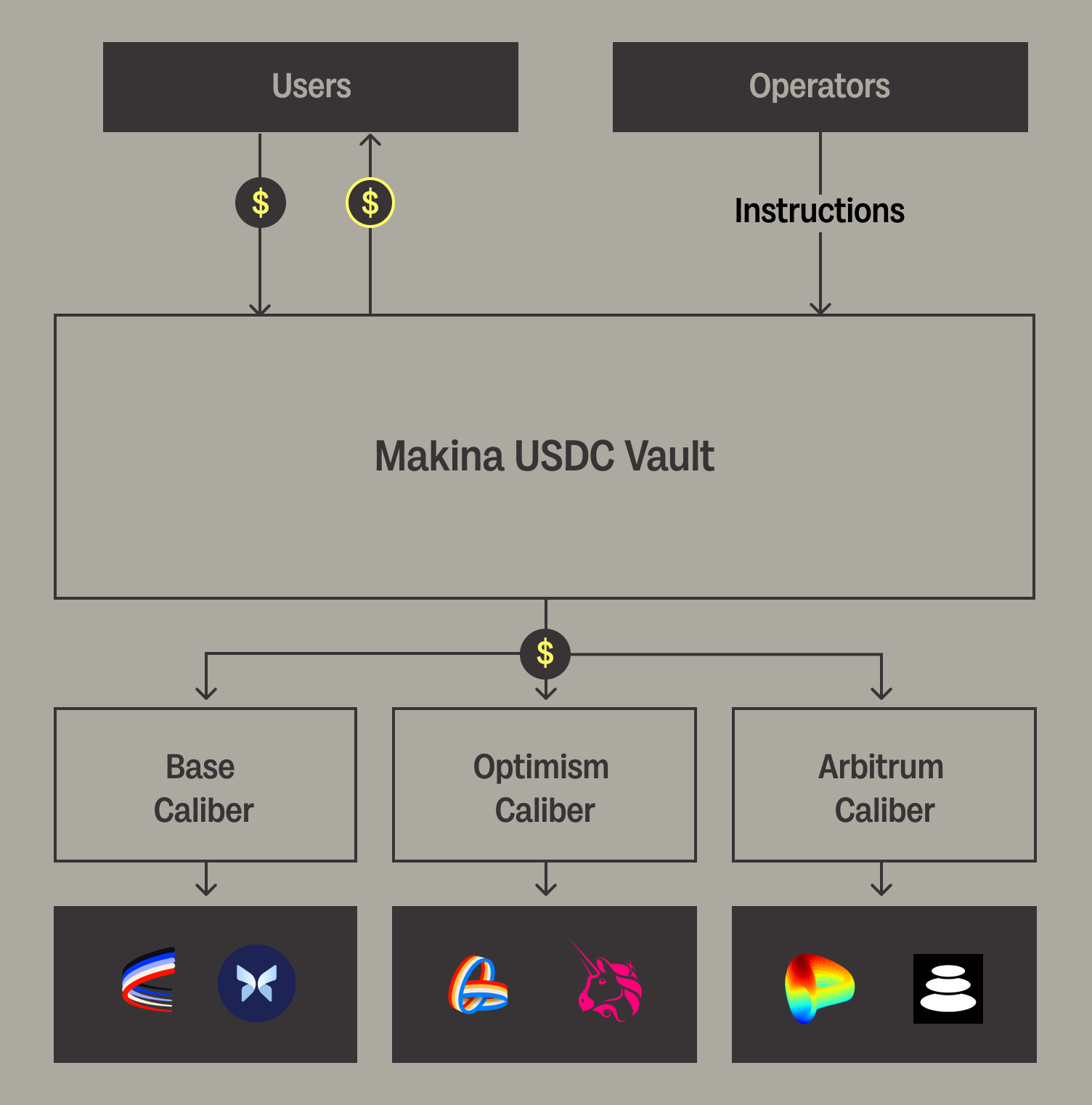 Once funds are deposited, Makina’s Operators, expert strategists or AI-driven agents, deploy assets across DeFi protocols to optimize yield. Execution is automated and constrained by strict risk controls.