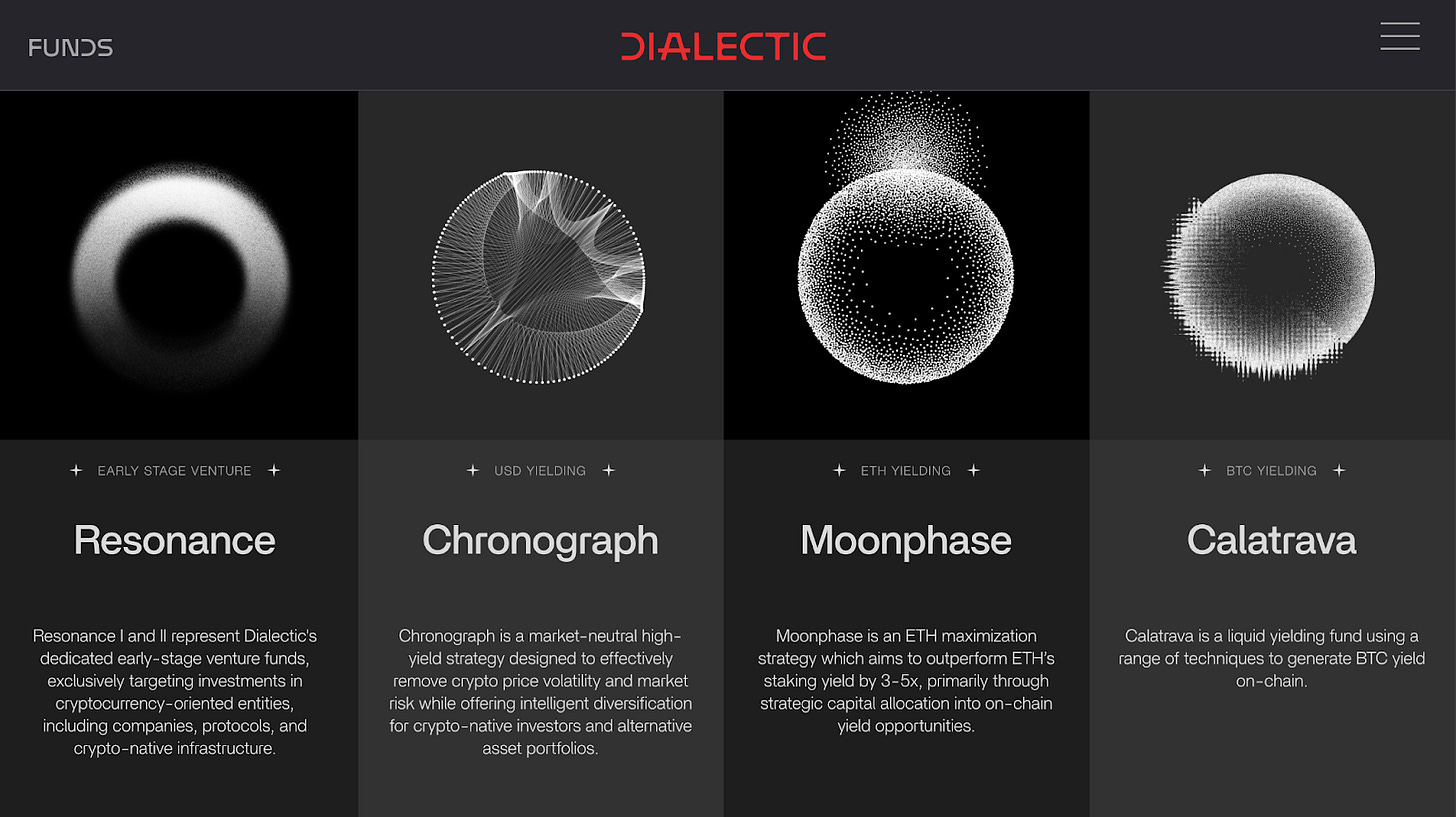 Dialectic is a top-performing asset manager that focuses on producing yield through onchain strategies and generating risk-adjusted returns for its investors. They offer three flagship funds to cover a range of client needs: Chronograph for USD, Moonphase for ETH, and Calatrava for BTC. They have been operational for several years and have weathered the storms of bull markets, bear markets, and the risks that come with depositing into smart contracts. Historically, their fund has only been available to accredited investors and has generated very competitive yields. Now, for the first time, Dialectic will launch strategies that will be available for onchain users to deposit into.