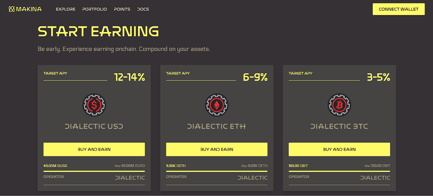 Dialectic will be running three different Machines for Makina to kick off Season 1: DUSD, DETH, and DBIT. These Machines will engage in a range of yield strategies for USD, ETH, and BTC.
